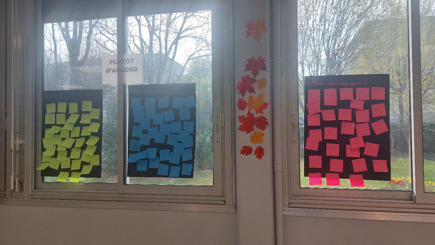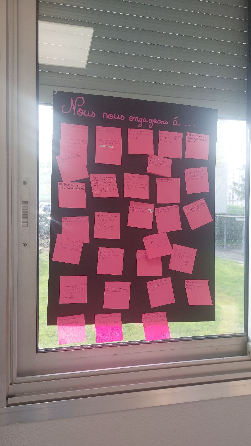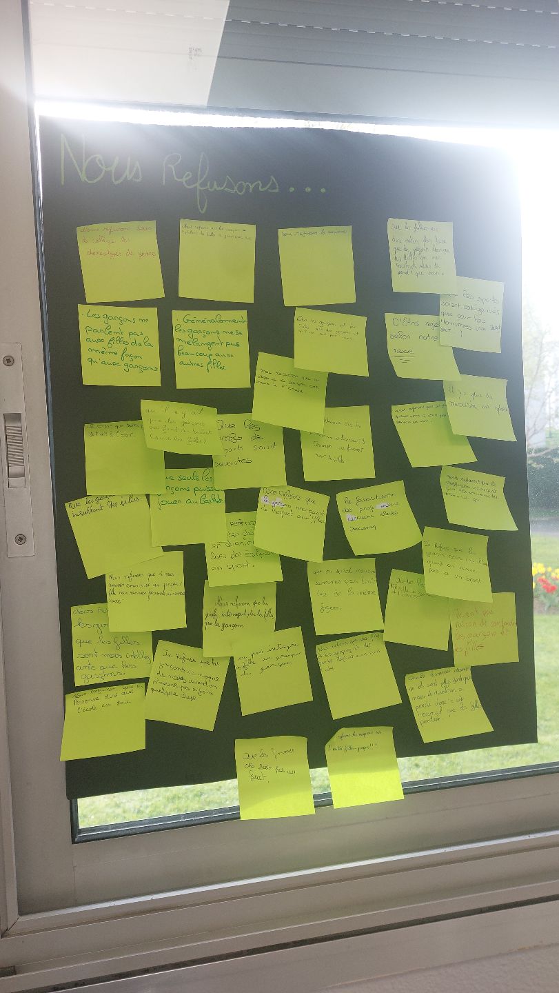 Ensuite, les élèves se sont questionnés sur les inégalités filles-garçons encore présentes au collège. Ils ont tous participé à la charte de l’égalité, où trois thèmes étaient proposés : « Nous refusons, Nous défendons l’idée que, Nous nous engageons à ». Tous les élèves ont participé et collaboré à cette charte, affichée ensuite dans le CDI.