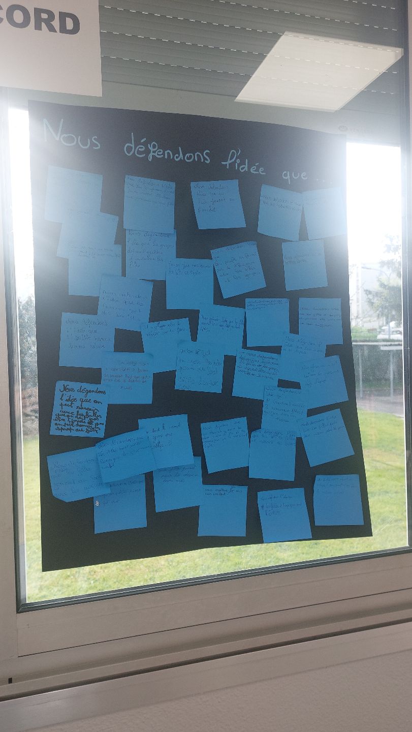 Les élèves ont fait un débat mouvant : une phrase stéréotypée était lue, et les élèves devaient décider s’ils étaient plutôt d’accord ou plutôt pas d’accord avec ce stéréotype de genre et se placer dans la salle en fonction de leur position, puis argumenter. Ceux qui étaient indécis pouvaient rester dans « la rivière du doute » et exposer leurs questionnements. Durant le débat, les élèves avaient la possibilité de changer de position s’ils trouvaient que l’argumentation du camp adverse était pertinente : ils pouvaient alors se déplacer dans l’espace pour changer de camp.
